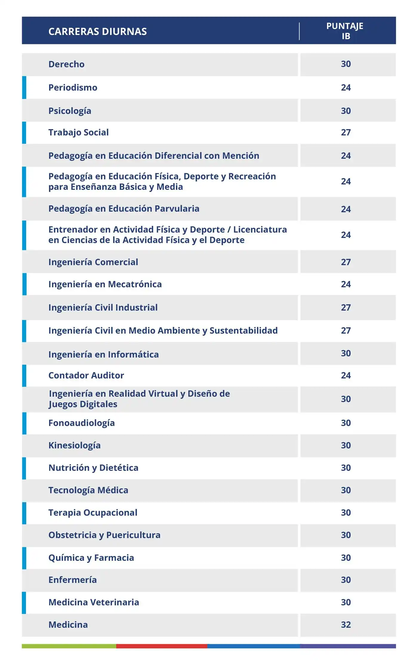 - Cumplir con el puntaje del diploma de Bachillerato Internacional exigido por cada carrera para postular por esta vía: